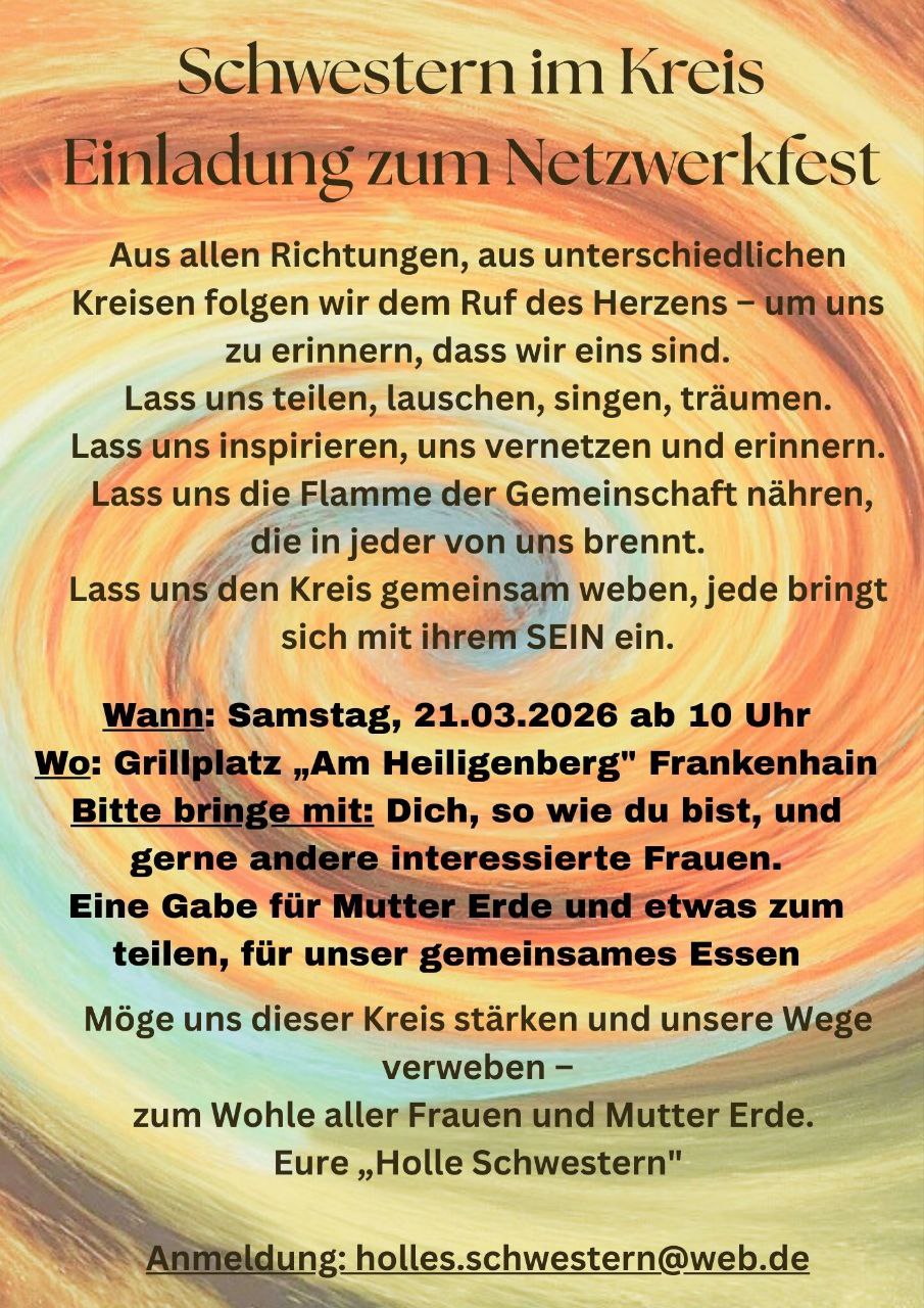 Frauen-Netzwerkfest Wann Sa.. 21. März 2026 10:00 - 16:00 Zum Kalender hinzufügen ICS herunterladen Google Kalender iCalendar Office 365 Outlook Live Wo Grillplatz "Am Heiligenberg" Frankenhain, Meißner
