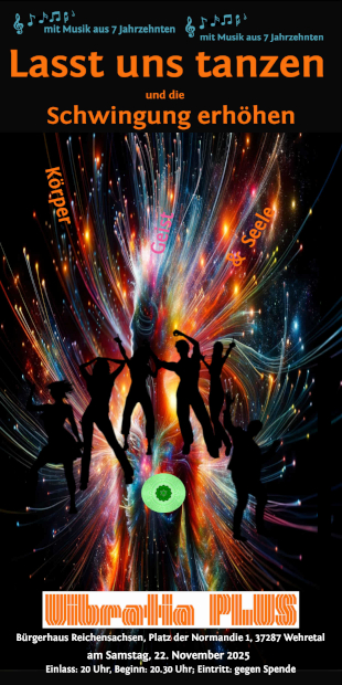 Tanzen für Körper, Geist und Seele: Vibratia Plus Wann Sa.. 22. November 2025 20:30 - 23:59 Zum Kalender hinzufügen ICS herunterladen Google Kalender iCalendar Office 365 Outlook Live Wo Bürgerhaus Reichensachsen Platz der Normandie 1, Wehretal „Coole Musik und viel Freude mit netten Leuten“: