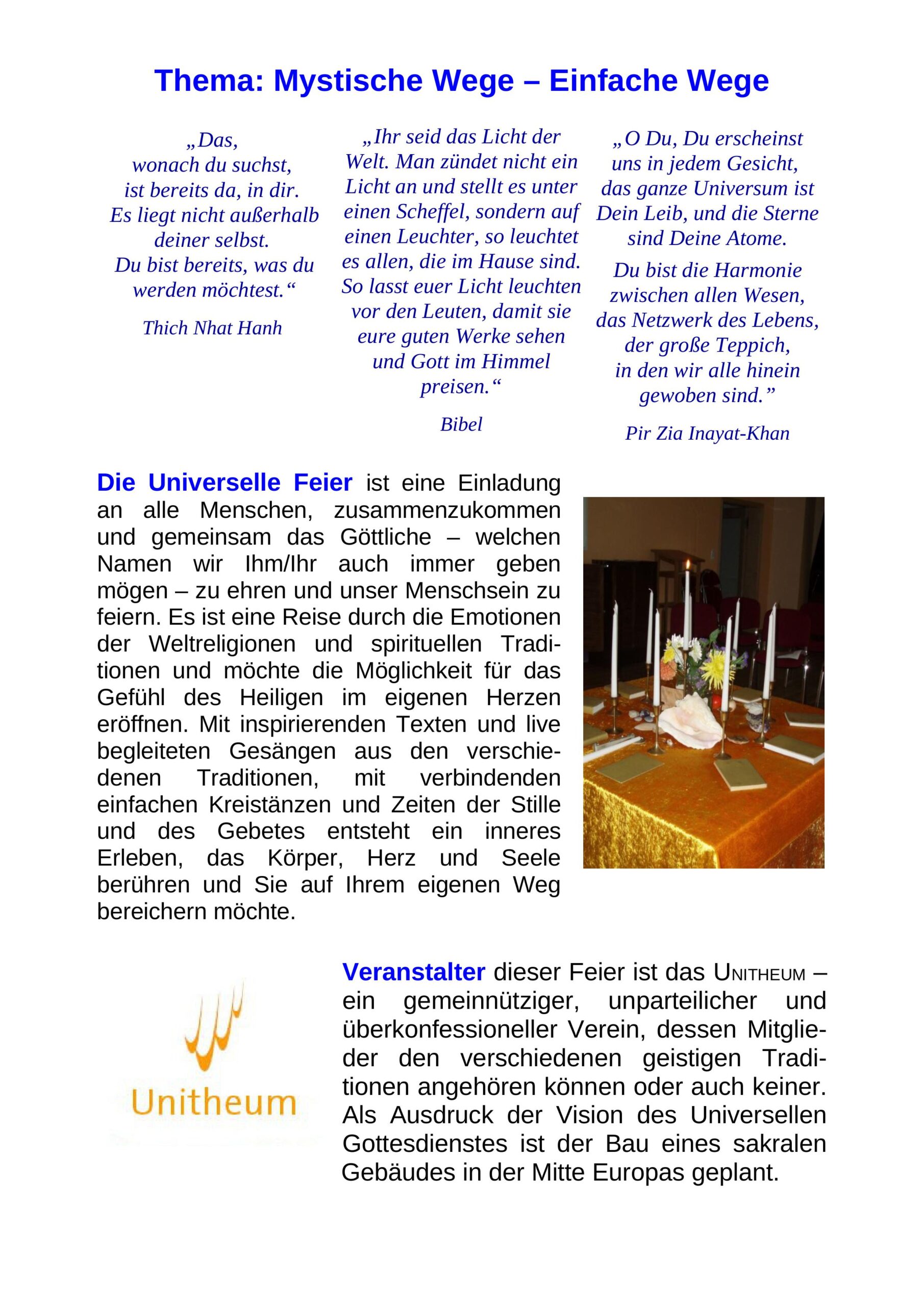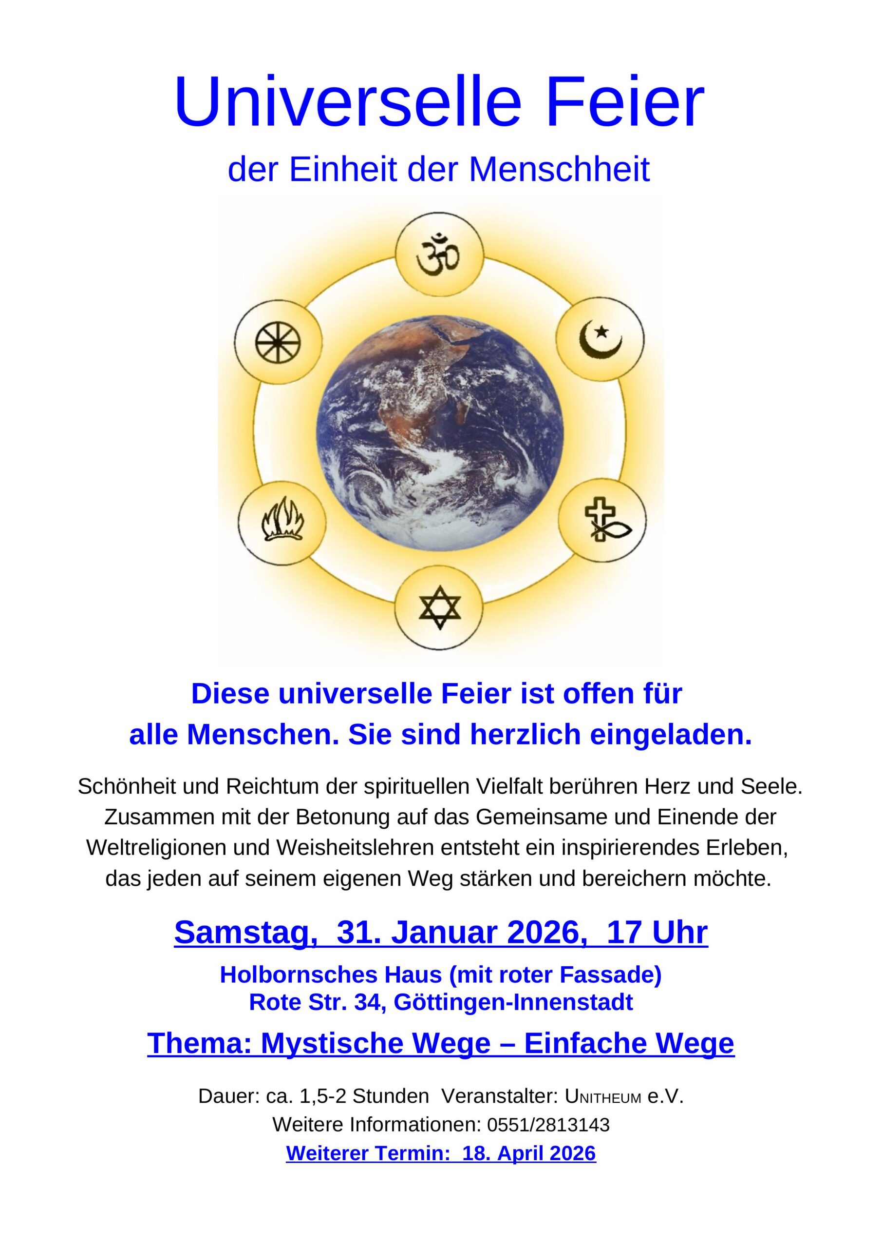 Universelle Feier der Einheit Wann Sa.. 31. Januar 2026 17:00 - 19:00 Zum Kalender hinzufügen ICS herunterladen Google Kalender iCalendar Office 365 Outlook Live Wo Holbornsches Haus Rote Str. 34, Göttingen